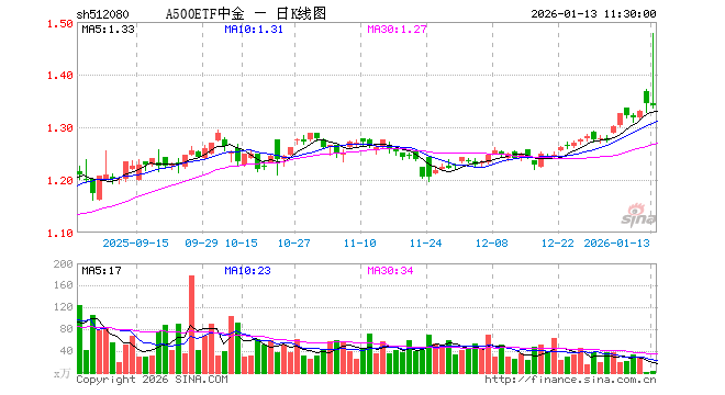 1月13日,截止午间收盘,A500ETF中金(512080)跌0.30%,报1.340元,成交额478.27万元。A500ETF中金(512080)重仓股方面,宁德时代截止午盘涨0.24%,贵州茅台跌0.30%,中国平安涨2.03%,招商银行跌0.05%,紫金矿业涨3.68%,美的集团跌2.02%,开云新易盛跌1.91%,中际旭创跌0.68%,东方财富跌0.84%,长江电力涨0.15%。