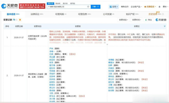 天眼查工商信息显示,近日,广发银行股份有限公司发生工商变更,白涛卸任董事长,由蔡希良接任,同时多位主要人员发生变更。