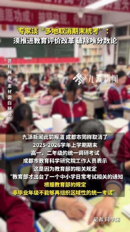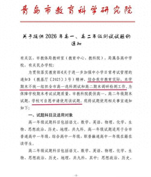 政策落地速度出乎好多人预料,2026年1月5日,成都市与青岛市先行推动,发布取消本学期末 高一、高二年级全市统一调研考试的文件,此事仿若推倒首排多米诺骨牌,北京多个区、福建省福州市、厦门市等地快速跟随,相继叫停面向非毕业年级的跨校或区域性统考,取而代之的是,考试命题权归还学校,由各校自行安排,与此同时,地方教研机构会提供试题库当作资源支撑,供学校自行选用。