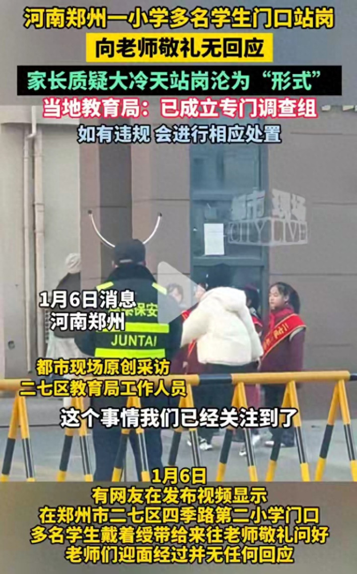 近日,河南郑州一所小学的视频引发全网热议:多名学生身披绶带站在校门口,在寒风中向路过老师敬礼问好,可不少老师却径直走进校园,全程没有任何回应。无独有偶,此前杭州某小学也出现过类似场景,学生列队向入校车辆敬礼喊“老师好”,车内老师却鲜有开窗回应的情况。这两起事件看似是小事,却戳中了大众的痛点——学生的真诚敬意被无视,不仅违背了尊师重教的传统师德,更与现代教育倡导的平等互动理念背道而驰。