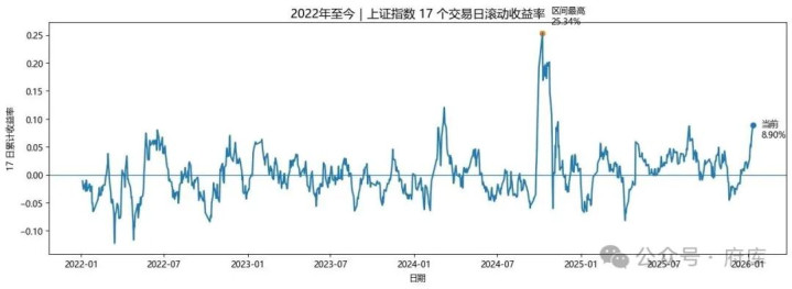 把时间拉得更长一些的话,从2022年至今,只有2024年9月底这一波快速上涨和2024年1月份的超跌反弹这两个阶段,17日涨跌幅超过了当前的状态,在相对比较长的一段时间内,最近这17天的上涨幅度,都属于比较快的情况了。