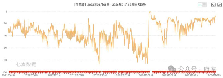 另外还有一个比较值得观察的数据,是几个股票、基金类App的排名,比如上面的同花顺与天天基金两个App,从2022年至今的排名趋势。有一个非常显著的特征就是行情低迷的时候,这些App的排名往往会下降比较厉害,当行情回升的时候,App的排名也会提高。当前这两个App的排名已经来到2022年以来比较高的位置了,说明很多投资者开始下载或者重新打开这些App了。