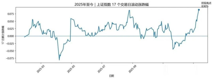 另外这17连阳的涨幅去做了一下测算,当前阶段涨幅为8.90%,从2025年至今的这一年左右的时间,已经处于最高的状态,超过了2025年8月份的这一波快速上涨。