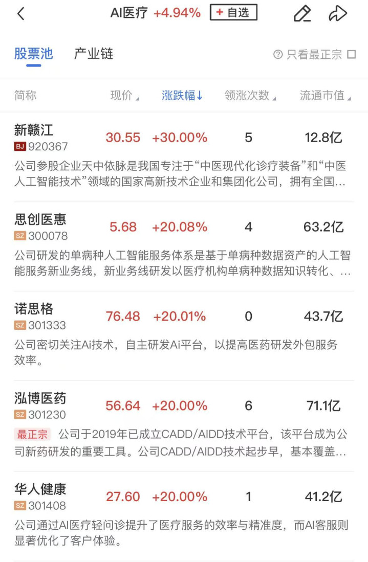 板块上,AI医疗概念股涨幅居前,泓博医药、迪安诊断、博济医药、贝瑞基因、国际医学、美年健康等涨停。