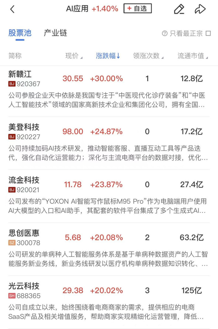 AI应用概念延续强势,引力传媒、利欧股份、省广集团、天龙集团、中公教育、浙文互联、浙数文化涨停。