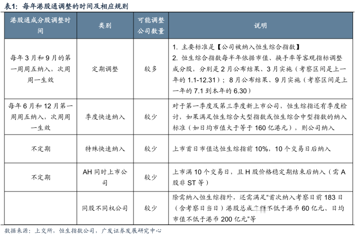 港股通纳入存在固定时点:每年3月和9月第一周周五(半年度调整),6月和12月第一周周五(季度快速纳入)。虽然部分龙头公司入通后获得南向资金快速流入,但全样本统计显示,入通后股价上涨并非普遍规律,不宜作为简单量化策略。