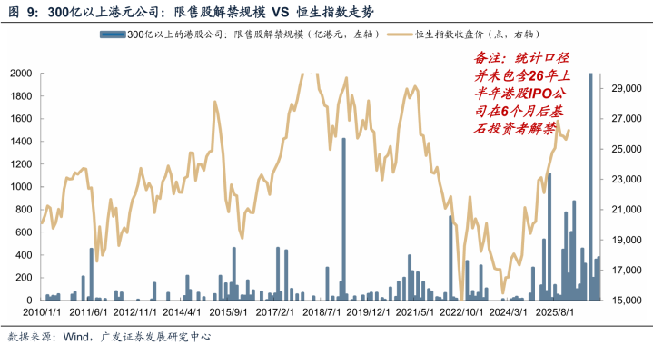 2026年将迎来两轮中大型公司(市值300亿港元以上)限售股解禁高峰:3月和9月。值得注意的是,这一统计尚未包含2026年上半年新上市公司在6个月后解禁的基石股份。相比传统测算方法,聚焦大市值公司解禁更具实际意义,因为小市值、低流动性公司即使解禁也难以形成有效抛压。