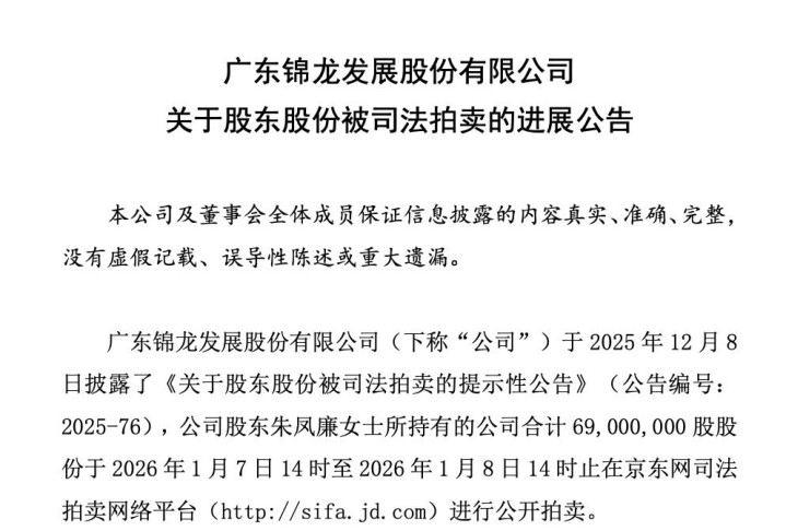 近日,在京东司法拍卖平台上,深交所上市公司锦龙股份(000712.SZ)6900万股司法拍卖结果引发市场关注。本次拍卖共分20个标的,仅2名自然人参与竞拍,除600万股以底价成交外,其余6300万股全部流拍。