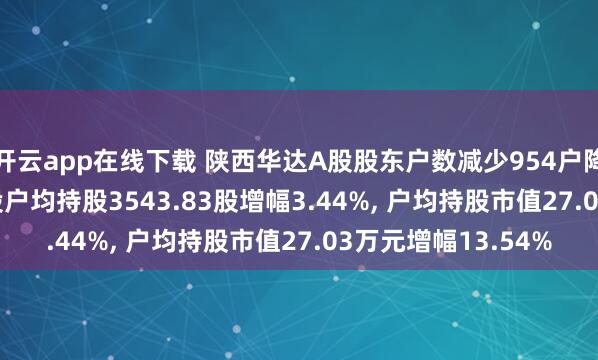 开云app在线下载 陕西华达A股股东户数减少954户降幅3.33%, 流通A股户均持股3543.83股增幅3.44%, 户均持股市值27.03万元增幅13.54%