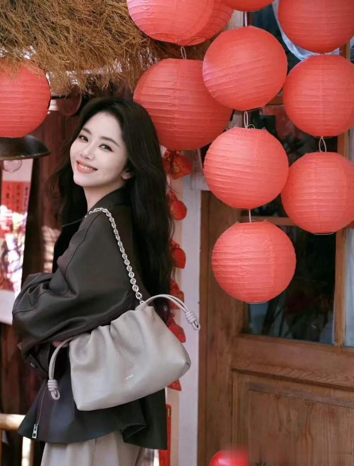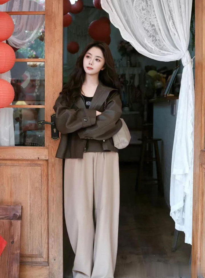 开云app在线下载 谭松韵的私服穿搭真时髦! 棕色皮夹克+背心+阔腿裤, 减龄又高级!