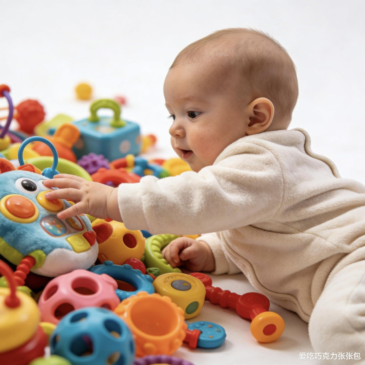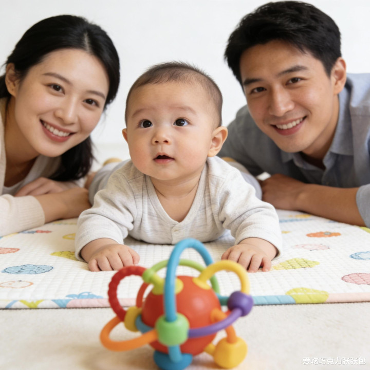 宝宝都是“小吃货”+“好奇宝宝”!把他喜欢的小玩具、颜色鲜艳的绘本,放在他身体一侧(稍微超出他的伸手范围),宝宝为了够到东西,会主动尝试侧身、翻身。